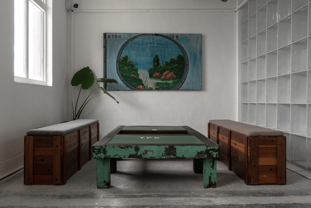 退役的木橫擔、輕鋼橫擔與變電箱成為組成再生家具的重要元素。