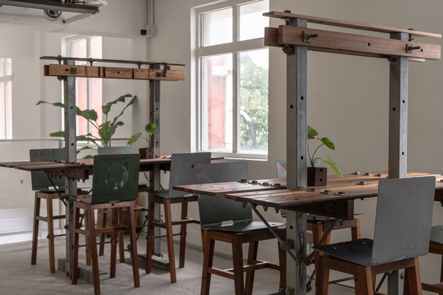 另一方面,也運用退役的木橫擔、輕鋼橫擔和變電箱,打造一系列再生家具,用於二樓座位區。這些材料在台電物料系統中本來就有嚴謹的規範,具備系統性與規格化的特性,因此在製作再生家具時,這些既有的規格都成為部件之間自然的連結方式。後續亦可延伸應用至全台各地的營業處和服務所,讓民眾更加理解材料與故事。