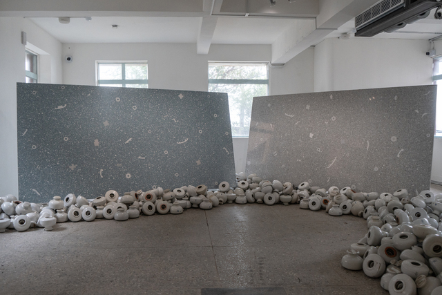 台電一年產出的退役礙子約有600多噸,這種高溫燒結的陶瓷無法回收再製,如何去化成為挑戰。META Design在人造石英石的基礎之上研發出「礙子石」,每片有60%成份來自退役礙子,先將礙子破碎成顆粒,轉化為具備量化比例的再生建材,同時也保留部分礙子原貌,讓表面呈現出礙子的輪廓圖樣。每5片礙子石可以去化1噸的退役礙子,這是一種務實的循環,不創造額外商品,而是讓廢棄物回到它能真正發揮效益的地方。