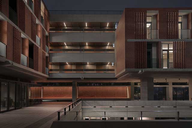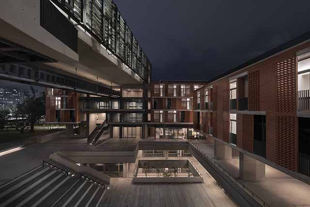 延續建築設計的思維,不另設外牆照明,以內斂、溫柔的光線,巧妙點亮建築內部,藉由室內透光的細膩層次,烘托學術場域的沉靜厚度,讓日常路徑被重新看見。照明引導空間動線,創造溫潤舒適的交流氛圍,讓光、人與場域彼此交互交織,持續照亮知識與探索的道路。