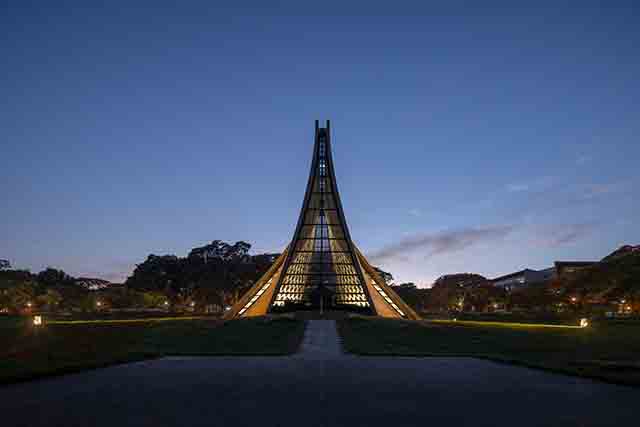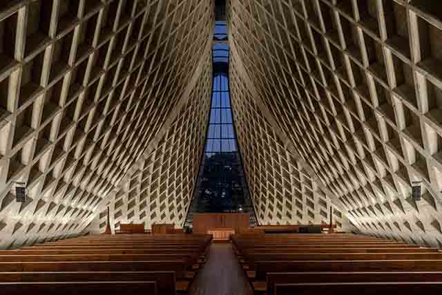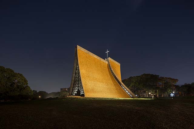 路思義教堂於1963年落成,由台灣建築師陳其寬與美籍華裔建築師貝聿銘共同設計,成為東海校園的精神象徵與現代建築經典之作,坐落於校園中央開闊地帶。建築本體由四片三度曲面板構成,形似倒置船腹,屋脊分離並設玻璃天窗,營造「一線天」意象,側窗溢入斜光,為室內增添神祕韻味。此次修復工程,回溯建築師對教堂的原初構想,在尊重既有空間精神的前提下,引入現代化燈具與整合性光環境規劃,精準運用人工照明,仿造天光的柔和與優雅,細膩襯托曲面稜線。