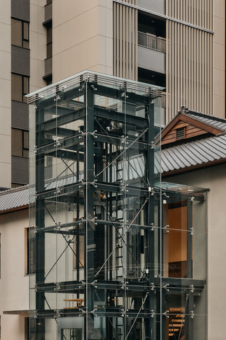 新增的電梯輕盈透明,精準嵌入於建築後方,避免破壞整體風貌。