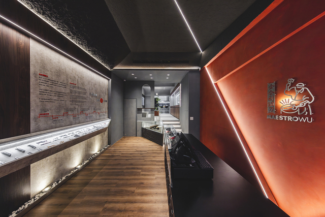隨著歷史的鋪陳沿階而上,兩側大面櫥窗展示著針對不同生活需求而生的系列刀具。展示區中央特別規劃由紅磚堆疊而成的特製座椅,巧妙連接金門傳統閩南建築的溫潤色澤,可在此感受紅磚的「暖」與金屬的「冷」交織而成的視覺淬鍊;盡頭則設有現代化中島廚房,提供刀具與料理的實地體驗,未來更預計結合直播與大眾分享烹飪美學。