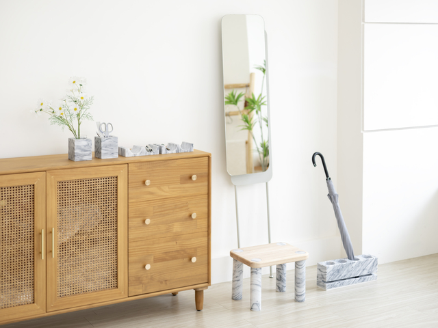 《一方玄關|大理石玄關家具組》正是在這樣的脈絡下誕生。作品由一塊完整的大理石為起點,發展出跟居家風景緊密對應的穿鞋凳、雨傘座、置物盤、筆筒與花器等玄關家具系統,乍看之下再平常不過的物件,其核心命題卻指向石材加工中長久以來被忽略的環節:材料耗損。
