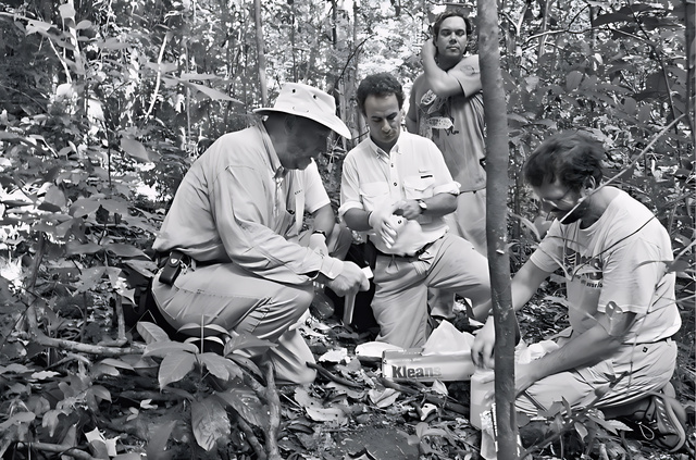 埃德雷奇.伯明翰(中)與克萊格.凡特(左)於巴拿馬巴羅科羅拉多島採取泥土樣本。2004年1月。