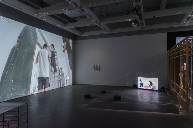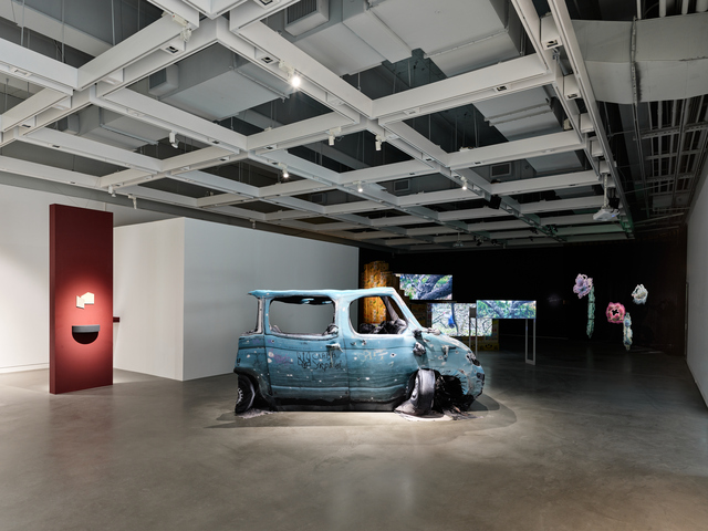 張宸瑋〈Volkswagen Transporter T5.gltf〉則利用 3D 影像技術將毀損汽車的數位模型覆蓋於軟性布料,透過輕盈媒材反襯俄烏戰爭的沉重議題,省思個體與遠方災難的關係。楊傑懷〈Working Holiday〉結合敘事影像與實驗參與的藝術行動,記錄藝術家與「小幫手」將白色恐怖紀念園區牢房改造成「民宿房間」的過程,通過度假的想像連結1950年代綠島政治受難者的歷史背景,叩問體制內的自由。