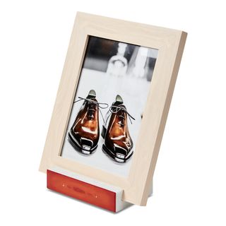 相框框架採用千金榆木並以燕尾榫卯拼接,支架則選用大理石材質,以磁性鎖扣系統方便更替照片。
