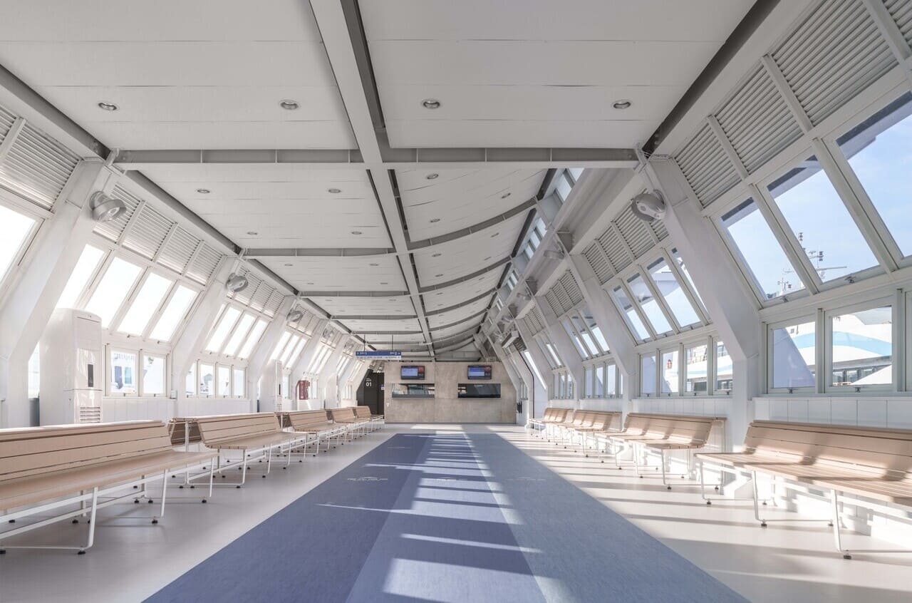 水平開展的弧形大屋頂,建構了山與海之間通透的交會點,斜向的大屋頂一方面呼應了島嶼岩壁的地勢,一方面以現代建築語彙和地方傳統建築的形式對話,不僅提供舒適的候船空間,完備島際轉運的功能,同時也將成為居民休憩交誼的生活場域。從屋頂大尺度切開形成的2樓觀景平台,連結1樓開放空間,讓人們從不同角度及高度眺望,可充分感受馬祖的山、海、風、陽光。