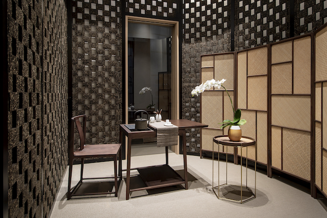 「清影」屏風,採用四曲疊扇屏制式,屏框以黑核桃木製成,將單屏分隔成大小框格,以三種不 同密度和紋理的竹絲鑲嵌花板嵌入其中。
