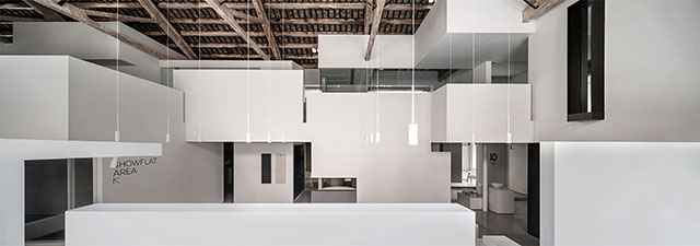 在尊重原有建築的結構與肌理基礎上,將工業遺跡轉變為展示場所,賦予老建築新的生命,1樓為衛浴的美學空間以及情景展示區,2樓則規劃為企業的辦公室。設計團隊在建築內部用極簡的體塊構築出抽象的山體,上下兩層相互滲透、模糊樓層邊界,透過行走過程獲得豐富的觀遊體驗,描繪「只緣身在此山中」的詩意意象,形成一個具有東方審美 趣味的空間。