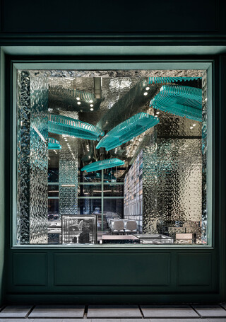 在「禮」的主題系列中,設計團隊為每個「禮盒」製作不同的波紋樣式,結合周圍水光瀲灩的牆身,讓陳列在空間中的珠寶展示櫃,好似裝載著珠寶的禮盒般漂浮於水中,低調優雅卻又亮眼矚目。整體色彩以綠、銀為主調,充分體現姑蘇水鄉雅致恬靜的氛圍,以及風雅古典的美感,踏入店中即感受水下世界的魅力,進而聯想到蘇州的人文景致,親身體會在地風情,細品其中所蘊含的歷史古韻。