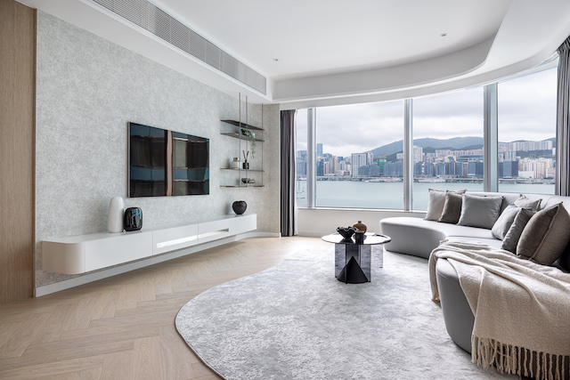 客廳倚著弧形窗景規劃。電視牆選用弧形圍飾板呼應空間的弧線布局,並以一質感豐富的壁紙呼應壯麗的海港風景;搭配古銅鋼飾加上特色雲石鋼材組成的吊架點綴,在簡約之中展現豐富的視覺層次。