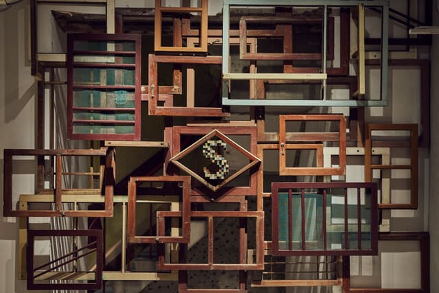 而二樓的木製裝置藝術同樣是吳透的作品,以不同顏色的台檜舊窗木料層疊拼貼成不同窗景,中央由木塊拼貼,高低錯落的菱形「S」,代表著昭和時代新州屋的家徽,高低錯落的形態同樣援引於當年從新州屋俯瞰全新竹時,街廓建築櫛比鱗次的樣子。