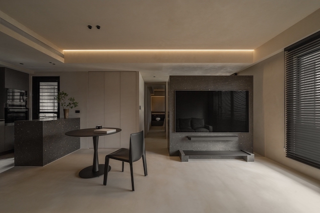 《峰巖翩翩》以石材作為暖灰調裡的軸心,在粗獷的塗料基底裡,用紮實的石紋肌理沈穩空間氣息;直橫交錯的冷冽場域,藉圓潤的曲面弧形,平衡剛柔之間的差距,為屋主演繹出一片踏實的生活場景。