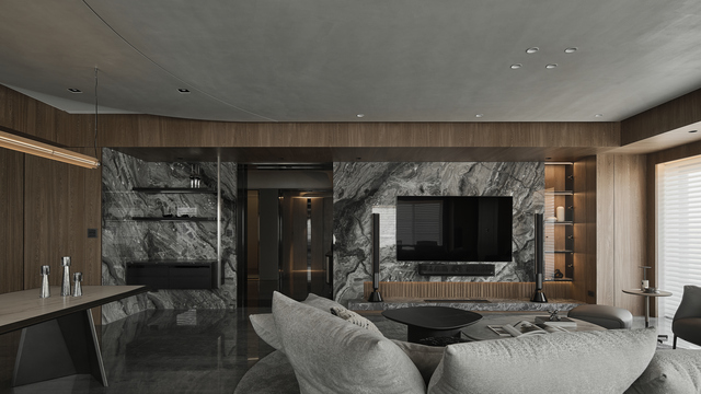 踏入玄關,大面石材鋪覆沉穩大氣,兩側隱藏式櫃體巧妙兼顧收納與美感。鍍鈦金屬包覆的通道門框,不僅勾勒低調奢華的層次,更為空間轉換勾勒具儀式感的過渡情境。開放式公領域串聯起客廳、餐廳與多功能室,讓家人間的互動更加緊密。天花突破傳統束縛,運用雕塑般的切挖手法與自然曲線,創造高低錯落的無聲韻律。光影在空間中自由流動,與材質肌理相互輝映,勾畫豐富的視覺層次。
