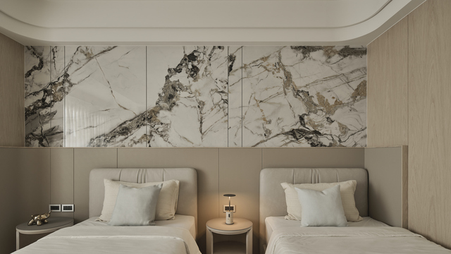 私領域隱於廊道盡頭,確保休憩場所的寧靜與隱私。主臥延續公領域設計語彙,以中性灰色調為基底,透過比例分割勾勒俐落質感,其格柵線條與石材肌理相互映襯,在簡約中流露細緻韻味。小孩房則以溫潤米白色調點綴清新氣息,搭配簡約家具為未來預留彈性。特別的是,每間臥室皆依窗景而設,讓居者在私密空間中也能與城市對話。