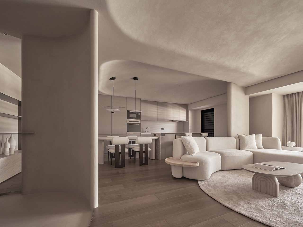 室內保留大面窗景,將公共空間規劃在採光面,並細膩引入自然光影與空間弧形語彙相搭,形塑溫潤的雅致居景。