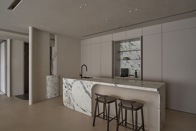 輕食區以同一色調串聯天地壁,中島則選用帶有淡綠紋理的羅馬白大理石鑄造,其不規則的圓弧切面與空間中的弧形語彙相映。中島後方門板選用相近色系,並採用抗汙抗刮的FINEX材料,將咖啡機等小家電完美隱藏,維持整體一致性,櫃內則搭配鐵件層板點綴細節。