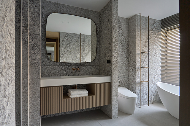主浴以整齊乾淨為主軸,因此採用一體成形的進口洗漱檯面以便清潔,搭配大面化妝鏡與層架融入曲面造型,兼具趣味性與掛毛巾等機能。牆面鋪陳硬度高、紋理細碎的皇家銀鑽大理石,霧面質感增添高級感與沉靜韻味。