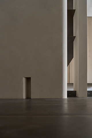 連接公、私領域的廊道,以一道曲面牆框圍,不僅避免從餐廳直視客廁的尷尬,同時塑造場景的過渡感。牆面選用帶有豐富肌理的石面,並透過脫縫設計引入柔和光帶,讓幽暗廊道轉化為充滿儀式感的轉換路徑。