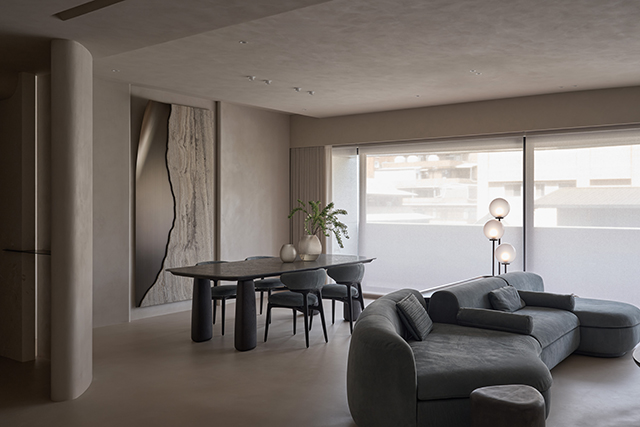 為打造讓屋主切換工作與生活、徹底放鬆身心靈的居家環境,因此公領域採開放式設計,客廳、餐廳與輕食區串聯一氣,顯得開闊明亮。客廳電視牆以礦物水泥塗料從上向下大面延伸,並帶有圓弧曲面,與懸浮的大理石電視矮台相呼應,其銜接處則以精緻的刷銅鐵件收邊,展現對細節的講究。擺置中央的進口沙發,其灰綠色澤與圓潤輪廓,不僅與空間自然相融,更延伸色彩至餐椅及石材中島,形塑連續性視野。
