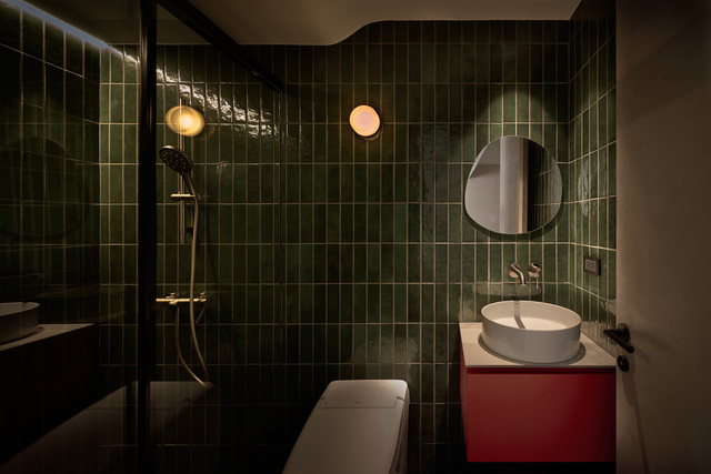 客浴的綠色小馬賽克磚營造復古奢華感。