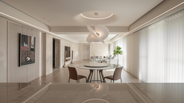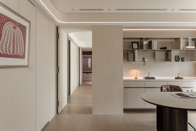 綜觀全貌,最鮮明的設計語彙來自於弧形線條的運用。利用柔和蜿蜒的弧度,巧妙地化解建築中原有樑柱的壓迫感,並在天花板、牆體與家具形體中延伸,化為貫穿全室、極具辨識度的元素。這些弧線既是結構的修飾,也是引導動線、界定場域的媒介,將客廳、餐廳與書房自然串聯,營造優雅而富生機的畫面。設計師以「光影流動、溫潤人文、材質交融」作為主軸,使室內流露出柔韌的藝術性,在弧線的環抱之中,日常起居與社交情境皆可自然而然地展開,凝聚成溫潤且具生命力的家居篇章。