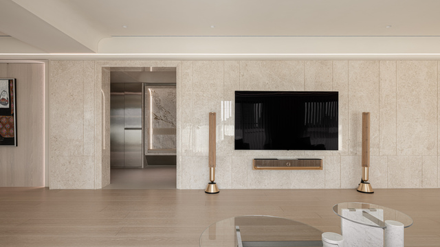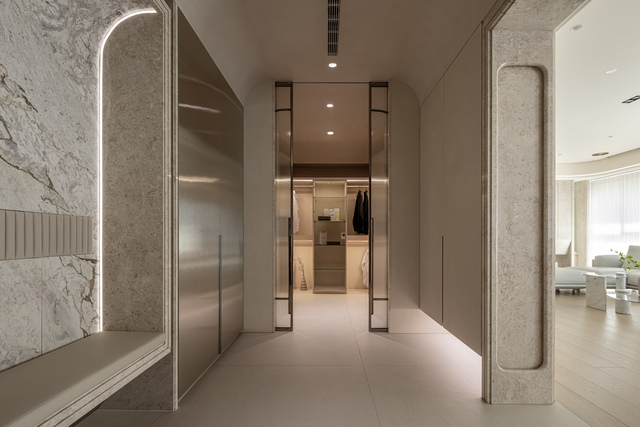 針對材質策略,本作利用質樸石材和塗料作為基底,鋪陳內斂沉穩之肌理,再搭配木皮與金屬的點綴,讓家宅在剛柔之間取得和諧平衡。色彩上則以米色、灰階等低彩度的輕柔中性色為主,避免厚重或冷峻感,使光線在材質間自在流轉,形成一種帶有人文溫度的語境,進一步彰顯團隊在材料比例和色調上的精準拿捏,演繹細膩而耐人尋味的表情。