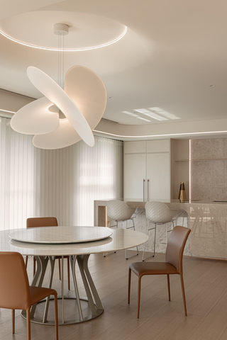 餐桌主燈有機的弧形型態強化了室內的雕塑感,亦成為視覺焦點。