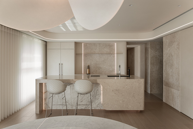 以天然石材與圓弧量體構築餐廚區塊,結合光帶細節,展現結構張力。
