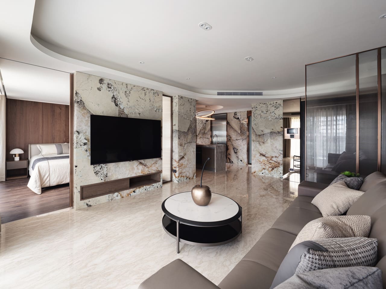 天然石材和鍍鈦柱體構築玄關端景,轉折間展開柔和的行進節奏。