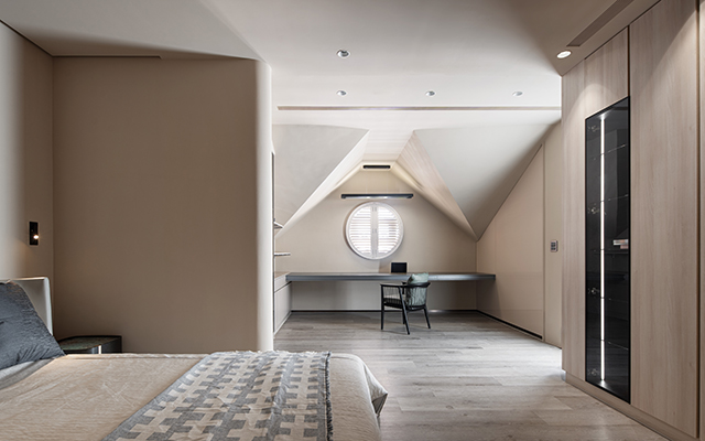 二樓作為私人領域,設計師在共用區增設了小型茶水吧檯,增添夜間時刻的便利性;主臥室的開窗將窗外盎然景色盡收眼底,另一間兼具書房機能的臥室則保留原始斜屋頂結構,成為獨具性格的空間表情。