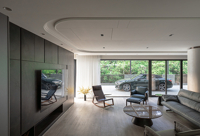 一樓作為親友休閒交誼的場域,呂世民特別將景觀留給客廳和餐廳。由於業主熱愛料理,廚房與餐廳比例幾乎成等比,使烹飪不只是生活行為,更是凝聚情感的重要媒介。原先位於基地中央的樓梯被挪移至側邊,釋放核心空間,同時規劃電梯及長親房,讓長輩便利且安全的享受尋常時光。