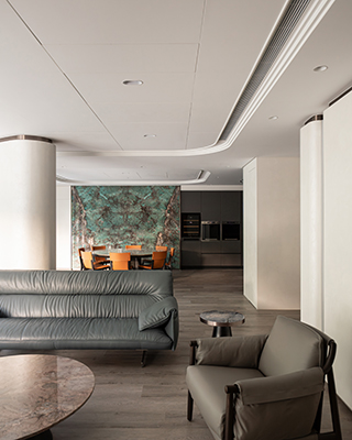 面對無法拆除的樑柱,相即團隊並未加以遮掩,而是將其轉化為空間特色──柱體藉由形變及包覆,抽象演繹溪流中的鵝卵石型態,既具收納機能,也營造獨有的韻律感,讓建築結構化作亮點。設計語彙則講求「純粹」,室內主體乾淨俐落,色彩主要來自兩個面向:其一是窗外綠意的延伸,其二是溪石意象的轉譯。業主期許將石材的時光積累以及粗獷細膩並存的質感帶入家中,因此,玄關牆面、餐廳牆面及餐桌桌面皆採大理石,為住家注入有機的肌理層次。