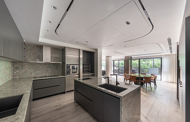 以開放式手法擘劃公領域,綠色石材烘托出如山林般靜謐的質地。