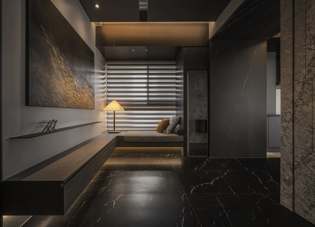 原先的三房格局經過重新梳理調整為兩房,透過減法策略釋放空間尺度,玄關作為返家的第一節點,是讓心境緩和的過渡場域,引領居者由喧囂城市走入靜謐天地;從玄關進入公共空間,再延伸至廊道與臥室,量體彼此錯落轉折,形成一連串接續卻又獨立的「框景」畫面,步行其中,如同展開一場緩慢流動的敘事。業主長期投身藝術、音樂及時尚領域,他們鍾情於深色系,對光線、質地乃至於器物選擇都極為講究,深刻影響著家宅樣貌的組成,每一個角落都是個性的縮影。