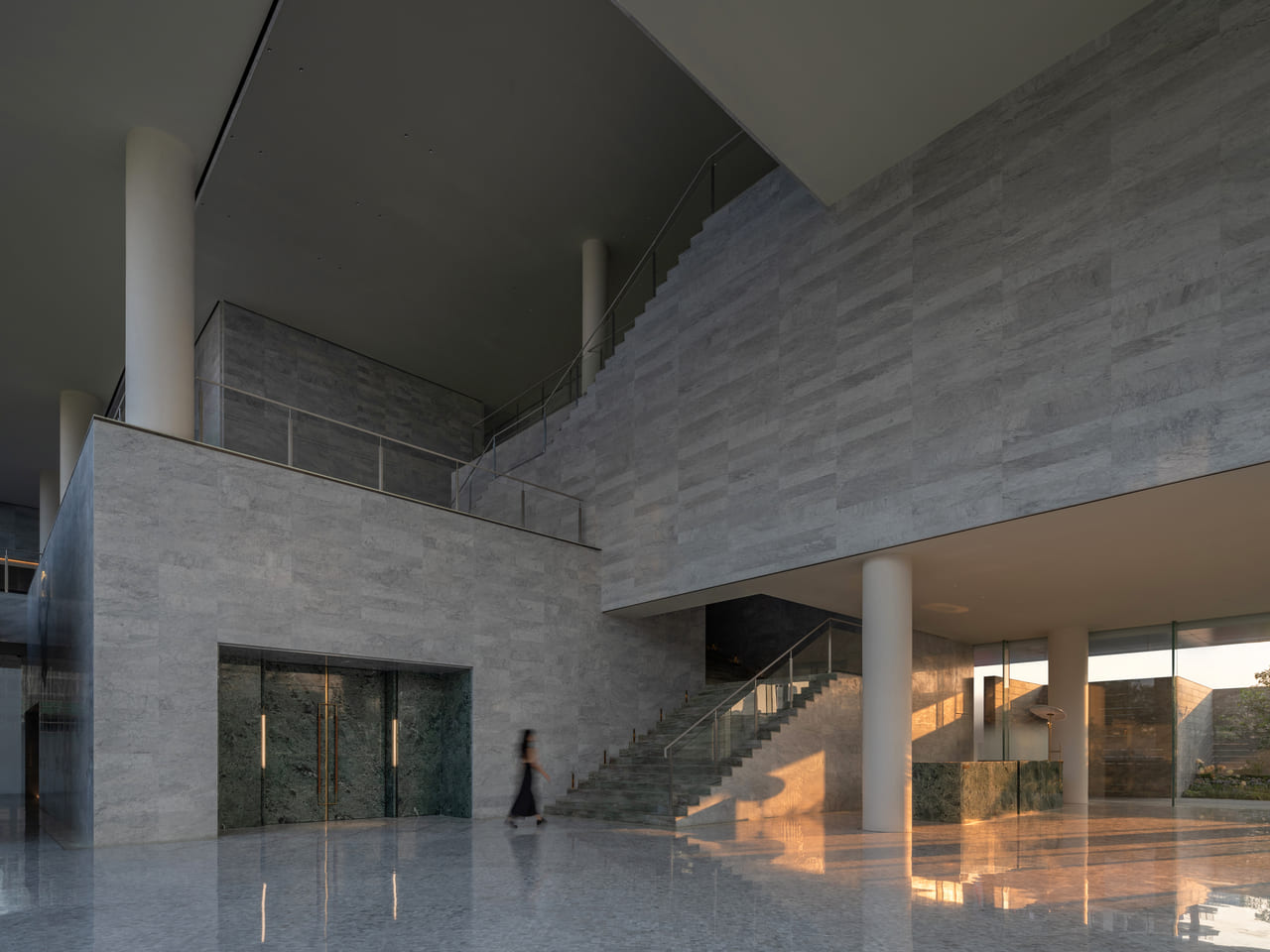 金屬光影與深色石材交織,讓場域在轉折處展現材料最純粹的語言。