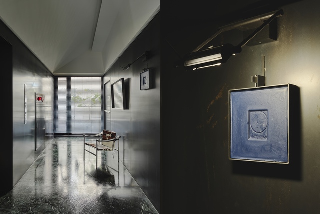 玄關。刻意壓低色調及光線穩定心境,藉此創造入內後豁然開朗的敞亮感。同時以「封蠟」呈現Logo。