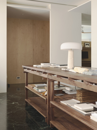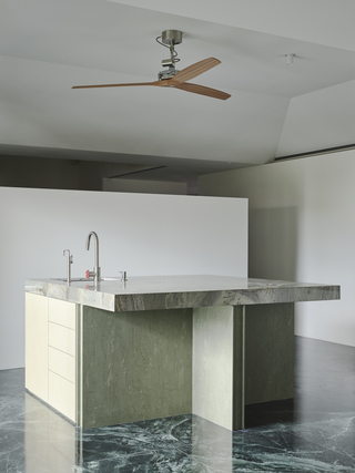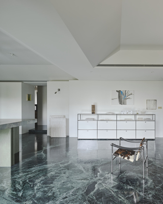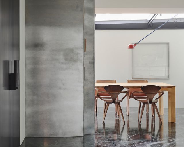 材料選擇亦注重時間性,蛇紋石地坪因能在多年後呈現自然磨耗的痕跡,以此記錄未來軌跡而首先被納入,生鐵、銅製開關面板、木材等也保留未加工的肌理,讓日後的氧化及鏽斑與時光共同寫下詩意篇章。