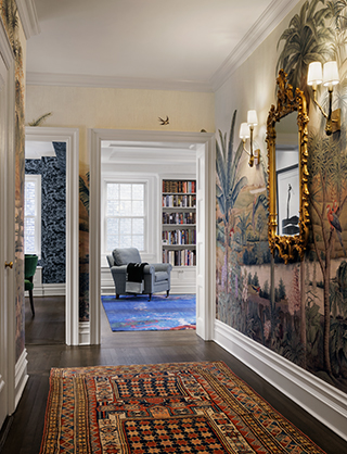 玄關選用Schumacher手繪全景壁紙揭開空間序曲,透過駱馬、猴群與珍禽等自然景觀的描繪,構築沉浸式迎賓場景。