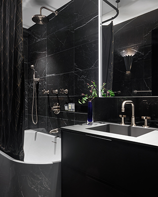 浴室大面鋪陳天然石材,其低調紋理勾畫靜謐奢華,並精準計算鋪設走向,完美契合空間尺度與動線。