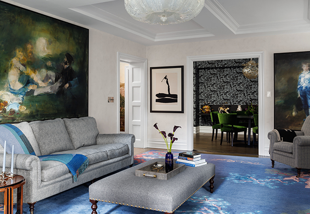 客廳裝飾藝術家Jake Wood-Evans的兩幅畫作,以其層疊的藍綠色調為全室奠定色彩基調,營塑深邃的藝術氣質。