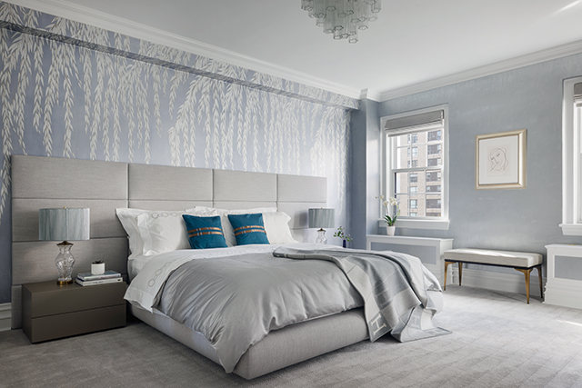 主臥選用Zuber垂柳壁紙與Stark Carpet的Elnora地毯,如夜風輕拂樹影,圍塑靜謐愜意的休憩環境。