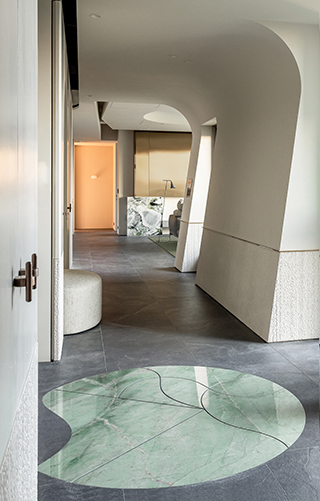 玄關以流線形綠石地坪開啟空間序幕,如蜿蜒河流,呼應窗外水景,並引導動線自然流動。