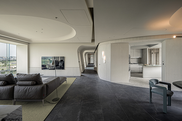 客廳以弧形天花修飾結構,光線輕映其上流轉,刻劃隨時間變幻的光影戲碼。