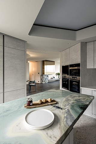 廊道弧牆向廚房延伸,如河道般細膩流淌,將餐廚區與客廳串聯一體,搭配廚房石材外牆,藉其細膩紋理點綴精緻。