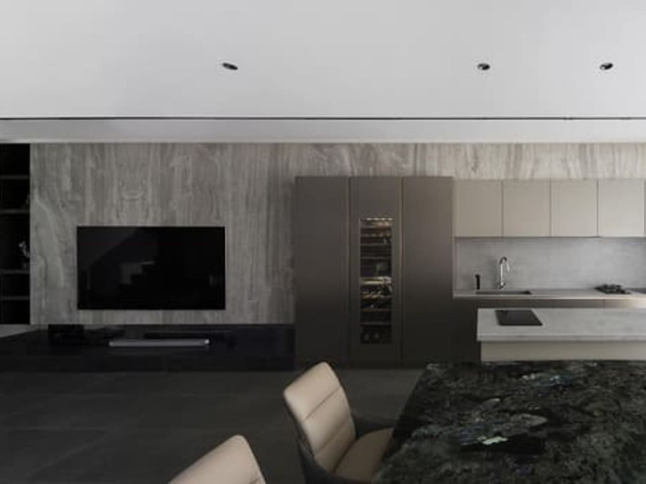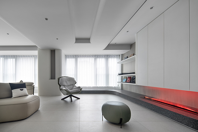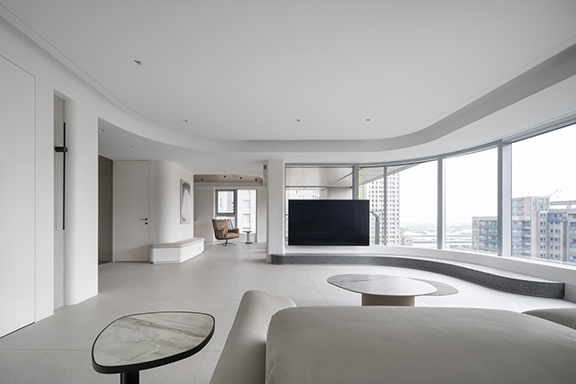 設計呼應建案特色,將建築弧線延伸入室,同時不以傳統電視牆為主,改以石材底座結合懸空電視,與窗景融為一體,將極簡風格推向極致。