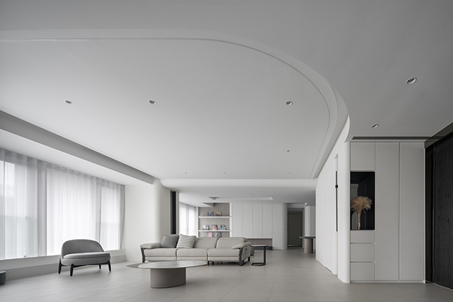 本作最引人入勝的莫過於那無處不在的「一筆弧線」。設計師刻意摒棄生硬轉折的直角,讓柔和曲線在牆面與櫃體之間悠然延伸。這不僅是形式上的轉變,更是對生活態度的隱喻。弧線的流動性,引導光影在室內自然游走,創造隨時間變幻的豐富層次,而這些曲線轉折,讓屋主在走動間,享受柔軟的視覺與游刃有餘的動線規劃,彷彿空間本身正在進行深長的呼吸,為極簡風格增添一股難得的節奏感。
