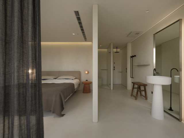 主臥室則因女主人偏好隱私,將睡寢與衛浴之間的半穿透設計轉為更實質的界定,但仍不設門片,再加上地坪的無縫接軌,強化了內部流動、安靜且不做作的氛圍。房內增設的書桌成為業主靜心工作、閱讀的角落,尺度收斂而不封閉,形塑出低調卻富層次的日常場景,保留一處安然沉澱的緩衝區域。