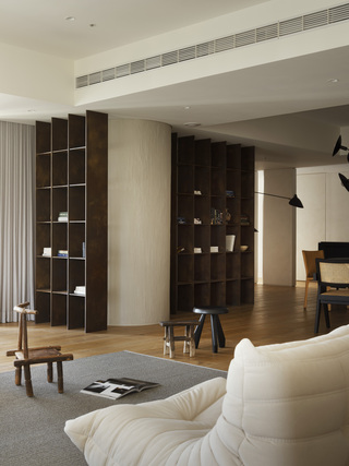 兩座頂天立地的書櫃圍繞著圓柱結構,嚴謹的序列意喻著業主對於秩序感的追尋。